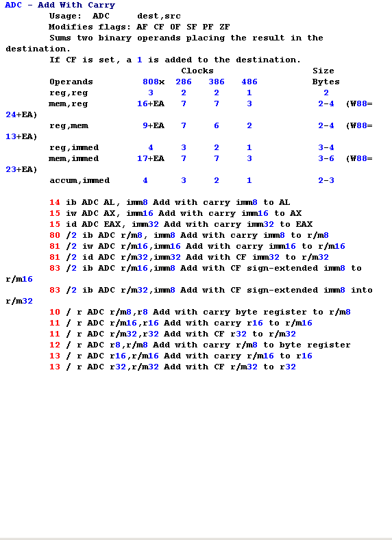 This file really does a lot to help you understand assembler and how to program the x86, but it can be daunting to look at, and I want to discuss one of the commands in some detail to help you understand the way to interpret the Help File.